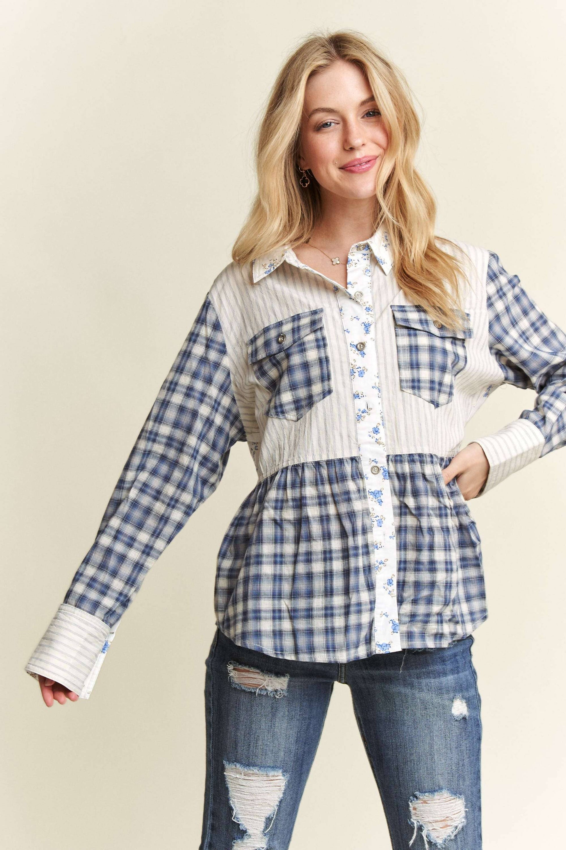ADORA LA - BUTTON DOWN FABRIC MIX BABYDOLL SHIRT