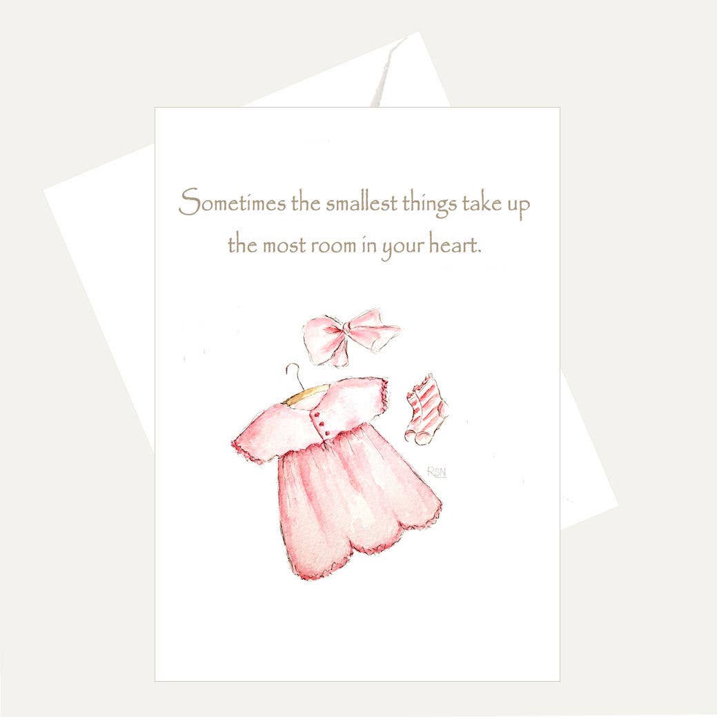 A precious watercolor Baby Card from Bellflower Girl LLC. It comes ready to welcome the new baby girl in your life! The Card showcases a dainty little girl's dress in pink, little striped socks, and a darling hair bow! From the watercolor archives of Rebecca from BFG. Our blank, white matte card comes with a self-sealing envelope. Front sentiment reads: 'Sometimes the smallest things take up the most room in your heart.' Approximately 4" x 6"