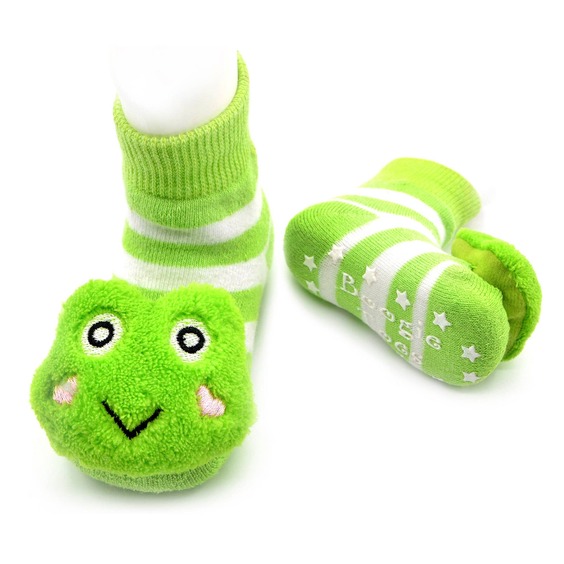 Eco-friendly, rubber grip-bottoms provide traction for new walkers. And wide-eyed frog faces double as rattles.