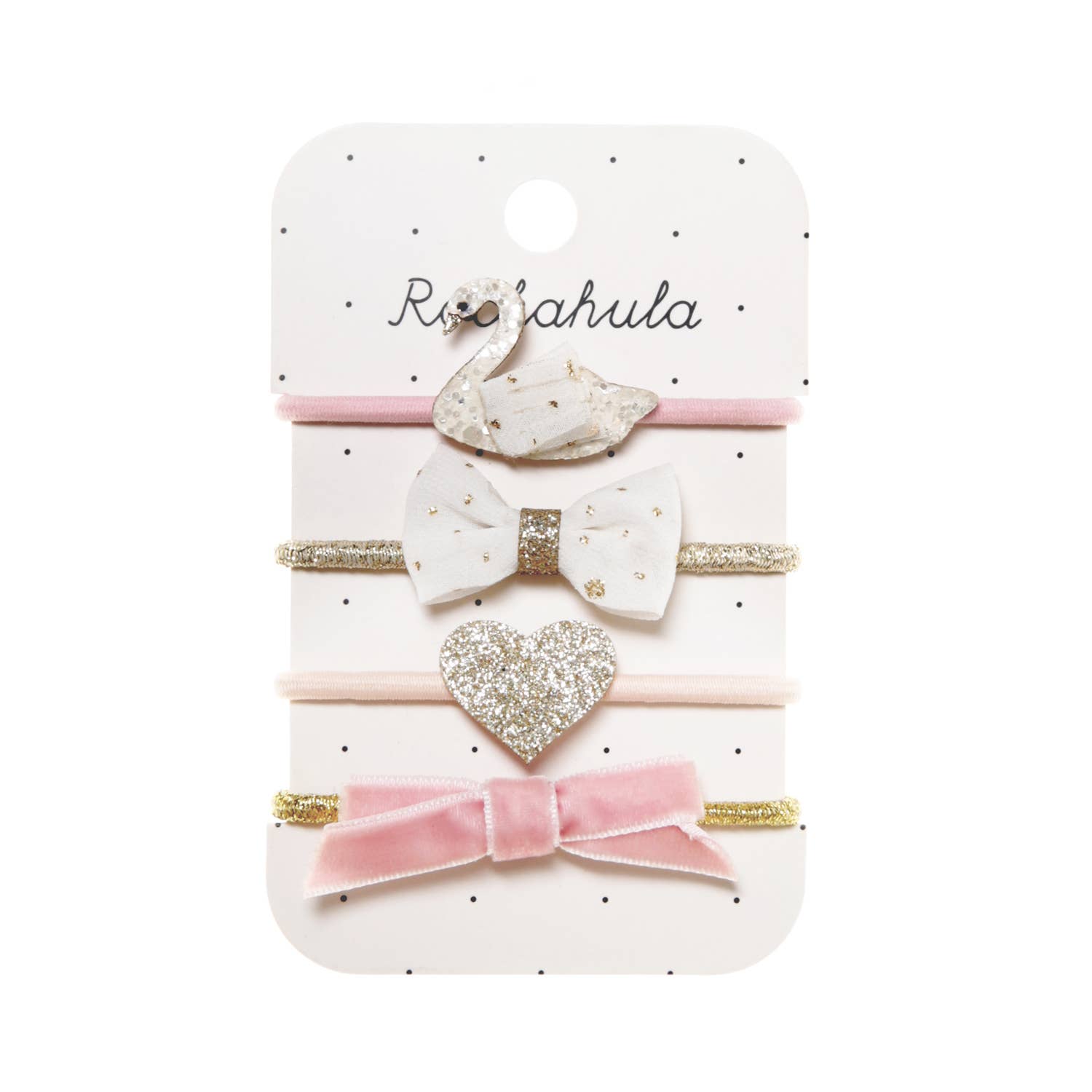 Sophia, our serenely graceful glittery swan adorns our pack of four ponies, which also feature a gold spotty bow, a plush velvet bow and and a glitter heart.