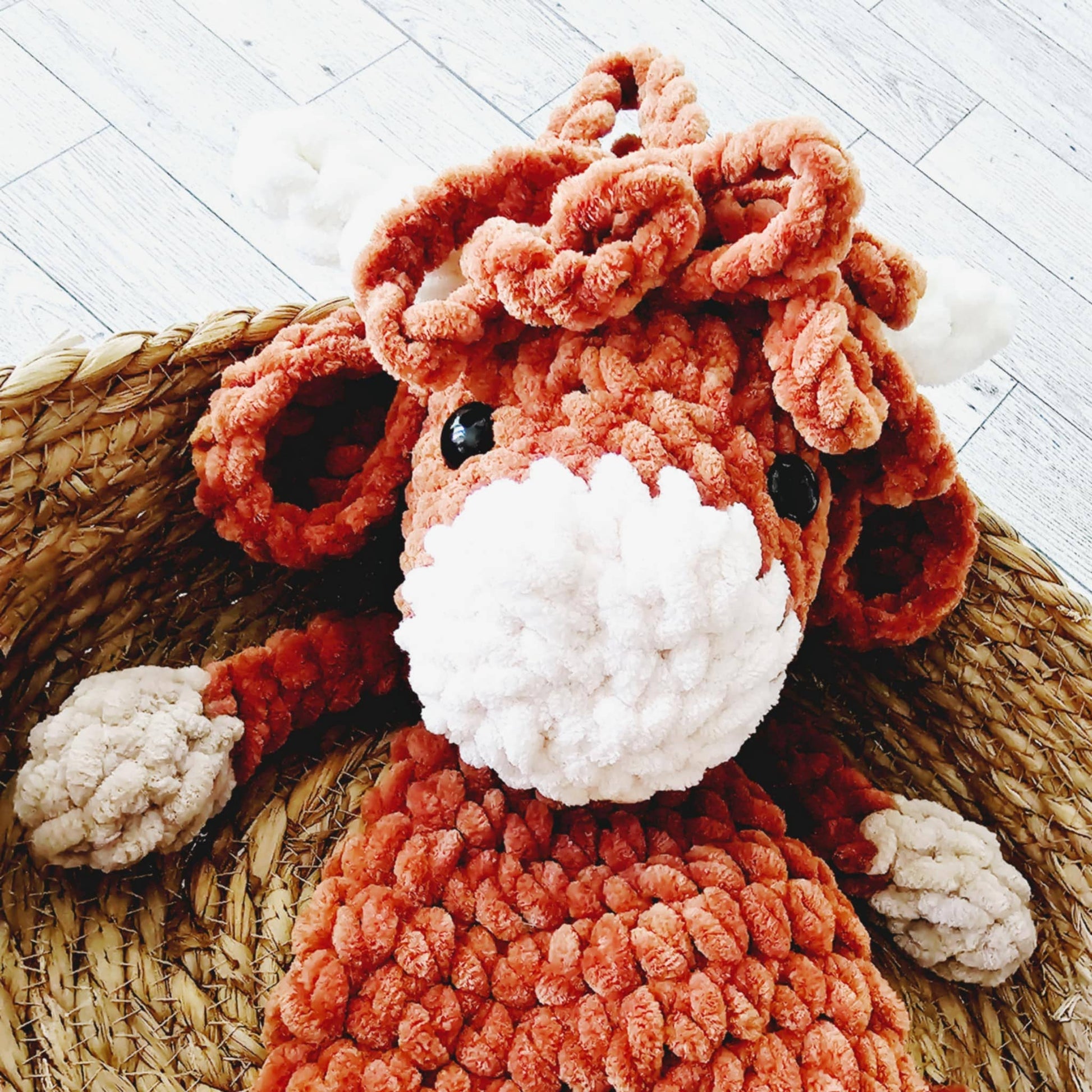 Handmade by us, for you! Get ready to gush over this adorable Crochet Highland Cow Snuggler! The soft, stuffed cow head is perfect for snuggles, while the unstuffed body is designed for easy grasping by tiny hands. The ultimate playtime and naptime companion for your little one, this toy will quickly become their new BFF. Measures approximately 15 inches tall.